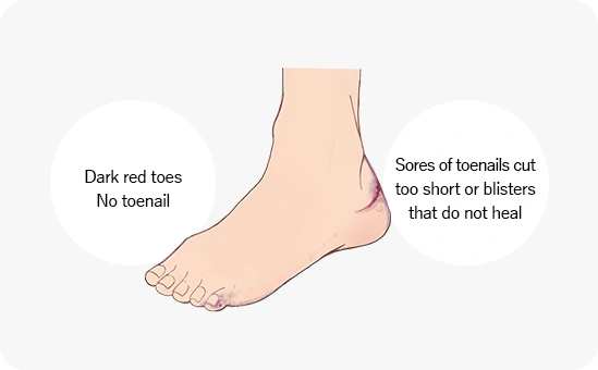 Symptoms of intermittent claudication or other concerning symptoms, including sores of toenails cut too short or blisters do not easily heal or dark red toes, may be a sign of a decreased blood flow. If you experience any of these symptoms, visit the cardiology, vascular surgery, or dermatology department.