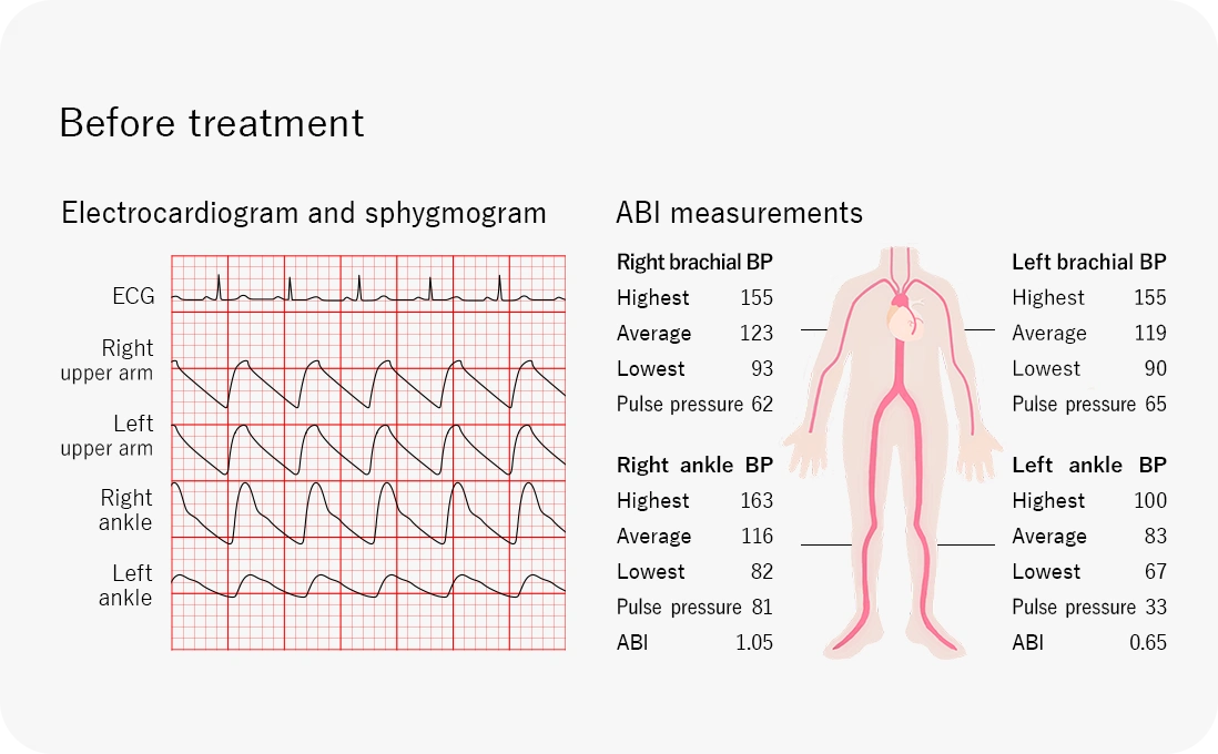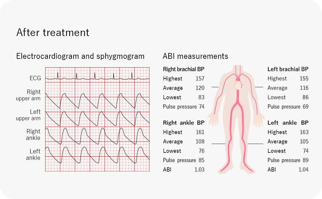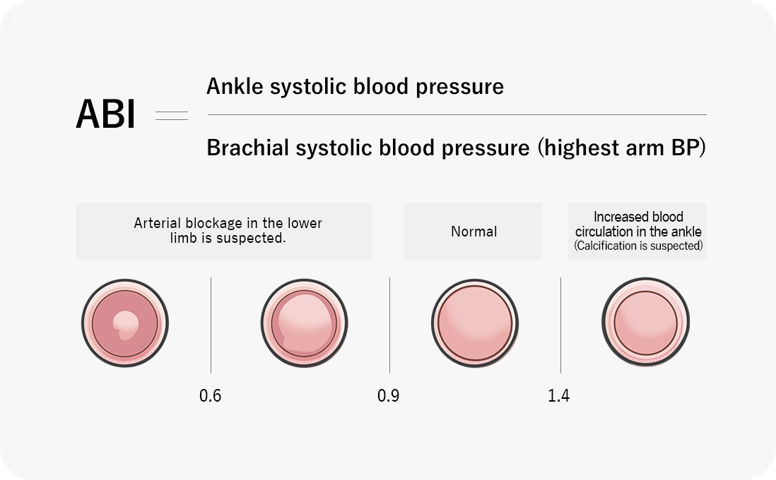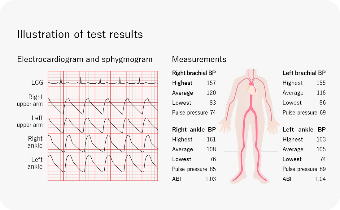 For this test, blood pressure is measured in the upper arms and ankles; the ratio of the blood pressure in the ankle to that in the arm is then calculated (the highest arm pressure is used as the reference).