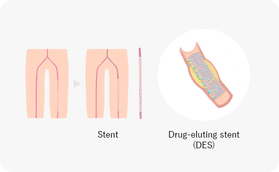A stent coated with a drug (DES: drug-eluting stent) prevents the blood vessel from becoming narrow again by slowly releasing the drug from the stent surface.